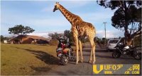 发情长颈鹿扑向重机 动作太大吓坏重机骑士